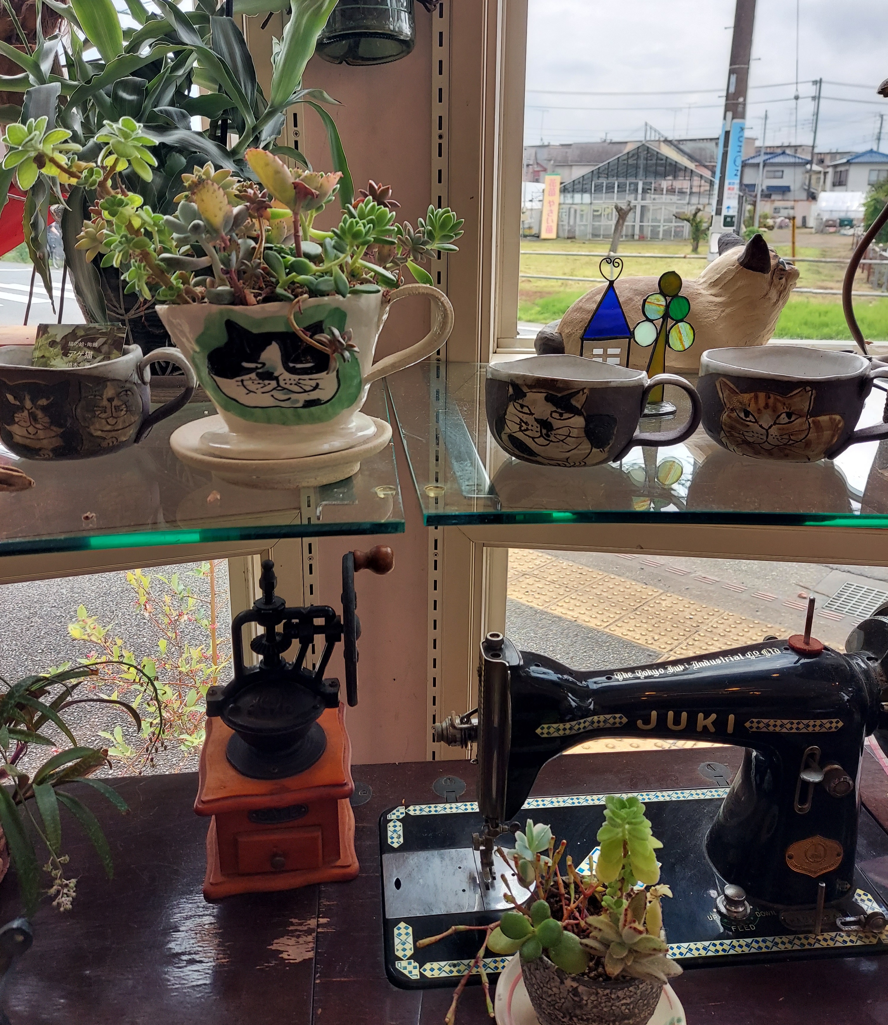 店内至る所に猫ものが展示され、グリーンや多肉ちゃんも程よく配置され癒しの空間となっています。