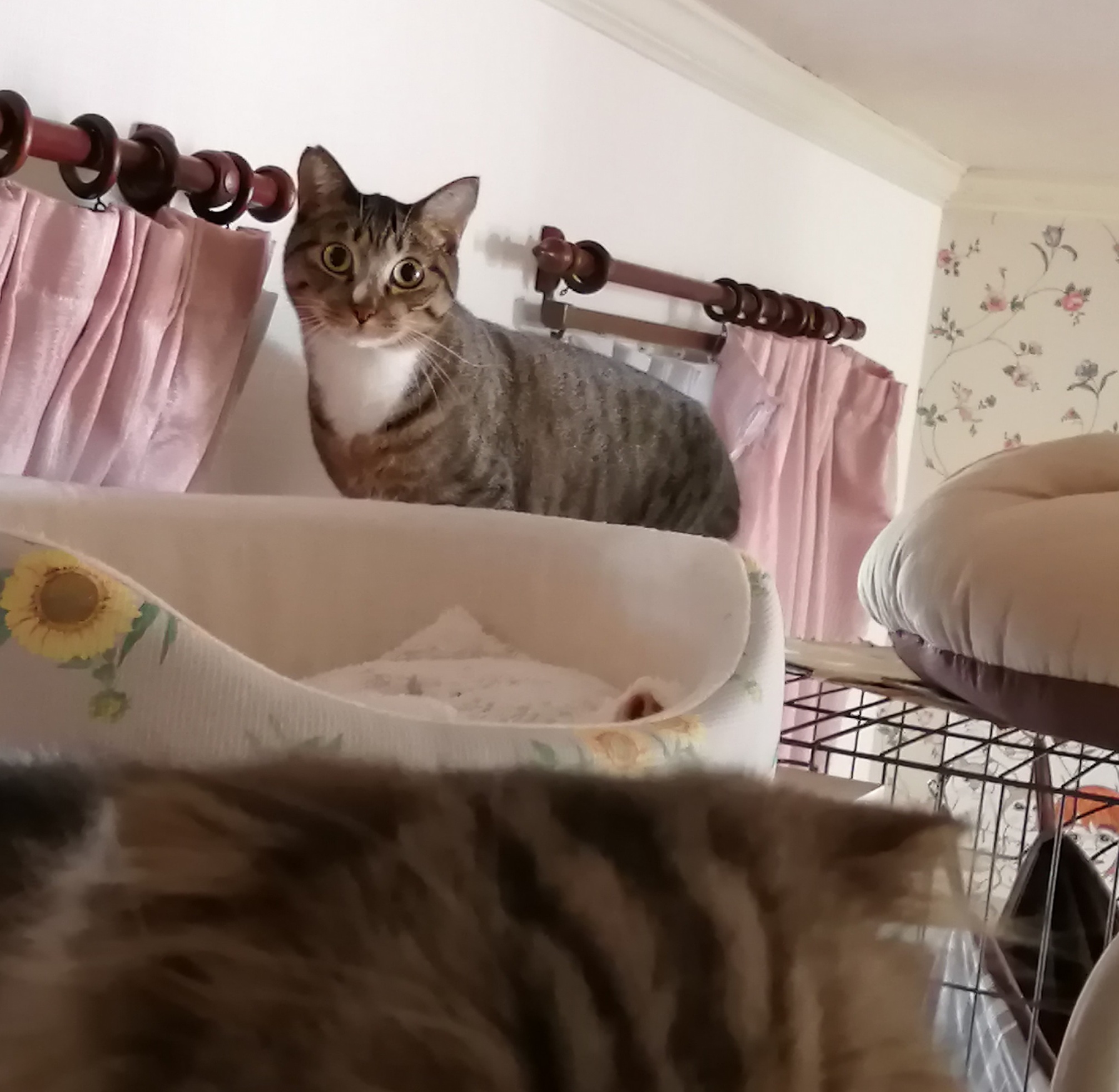 先住のゴマ君と窓際の猫タワーでお昼寝、幸せな光景ですね!