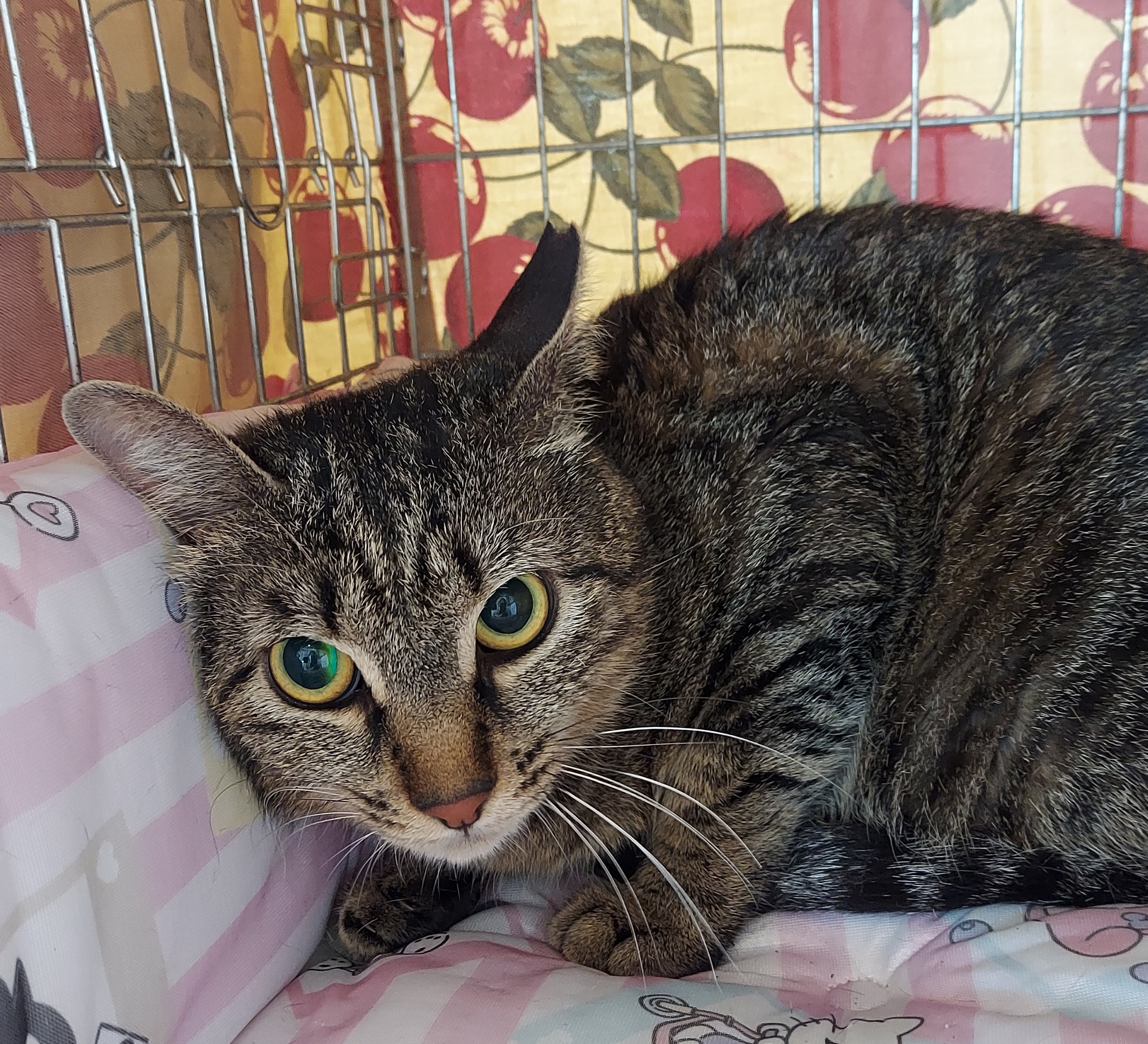小ゲージに入れられ車にのっての譲渡会参加は大嫌いななずなちゃんです。