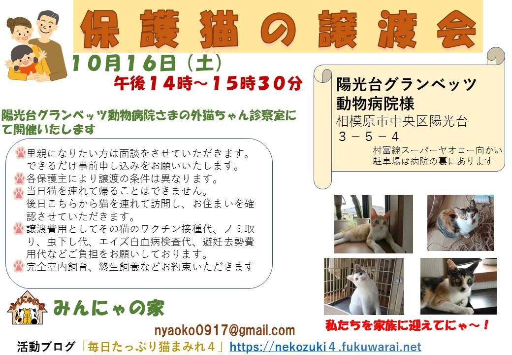 今週の土曜日、10月16日は陽光台グランベッツ動物病院さまの外猫診察室にて譲渡会を開催いたします。