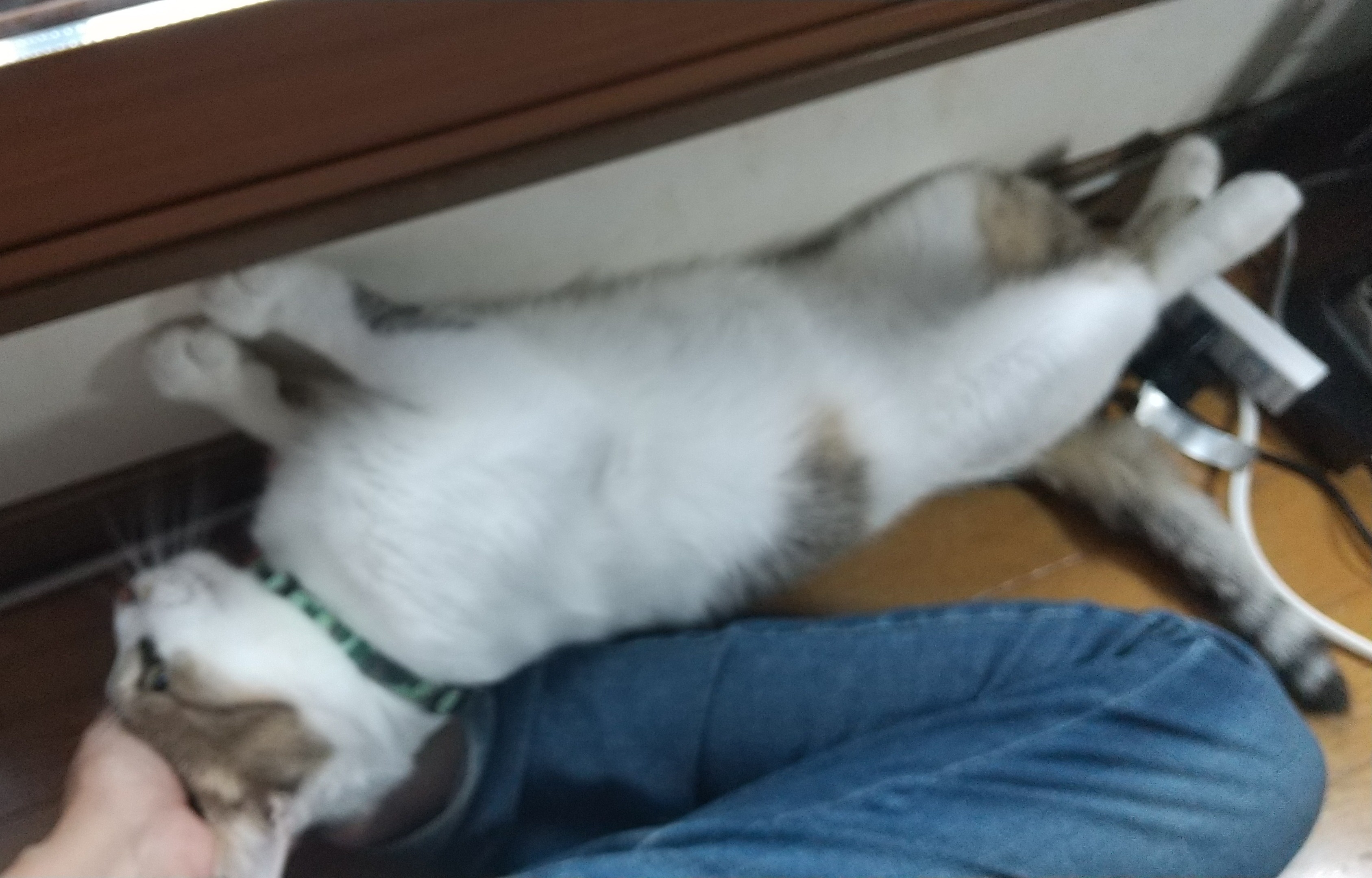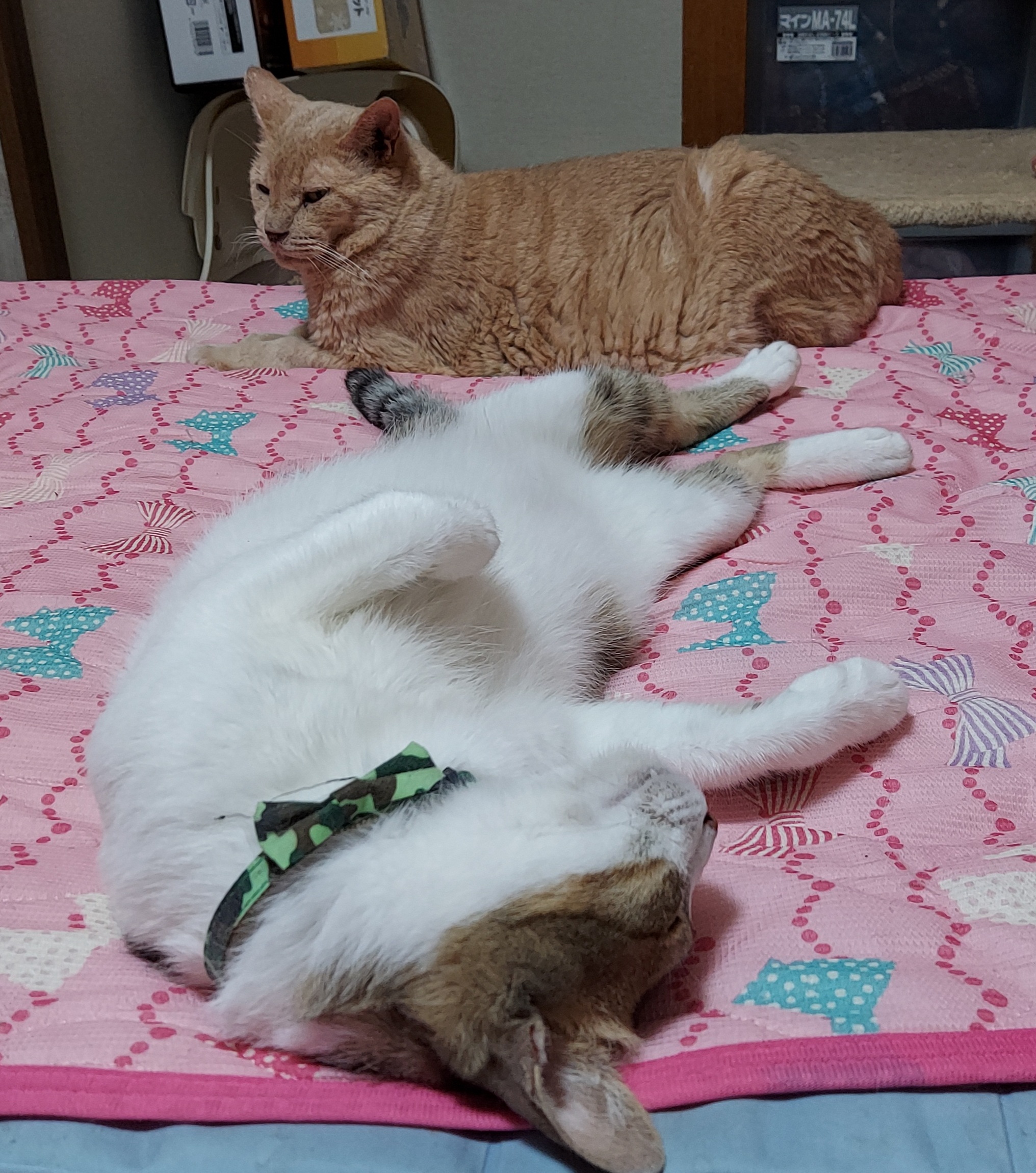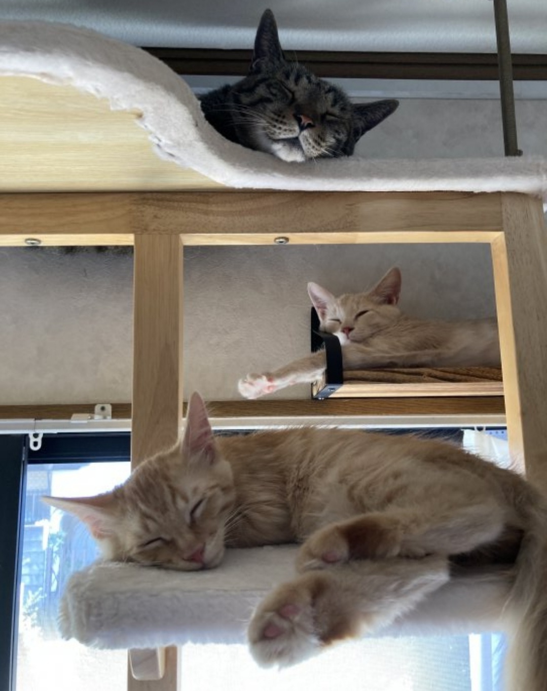 ナデナデするとお腹をゴロンと出しそうになるのですが、タワーの最上段はスペースが狭く落ちそうになるため食い止めます(笑)