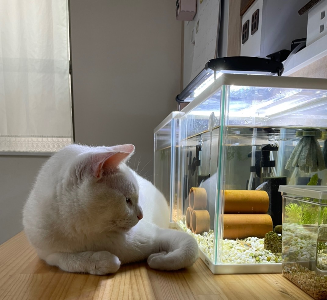 アオくん、メダカさんの水槽にいたづらはしないそうです。