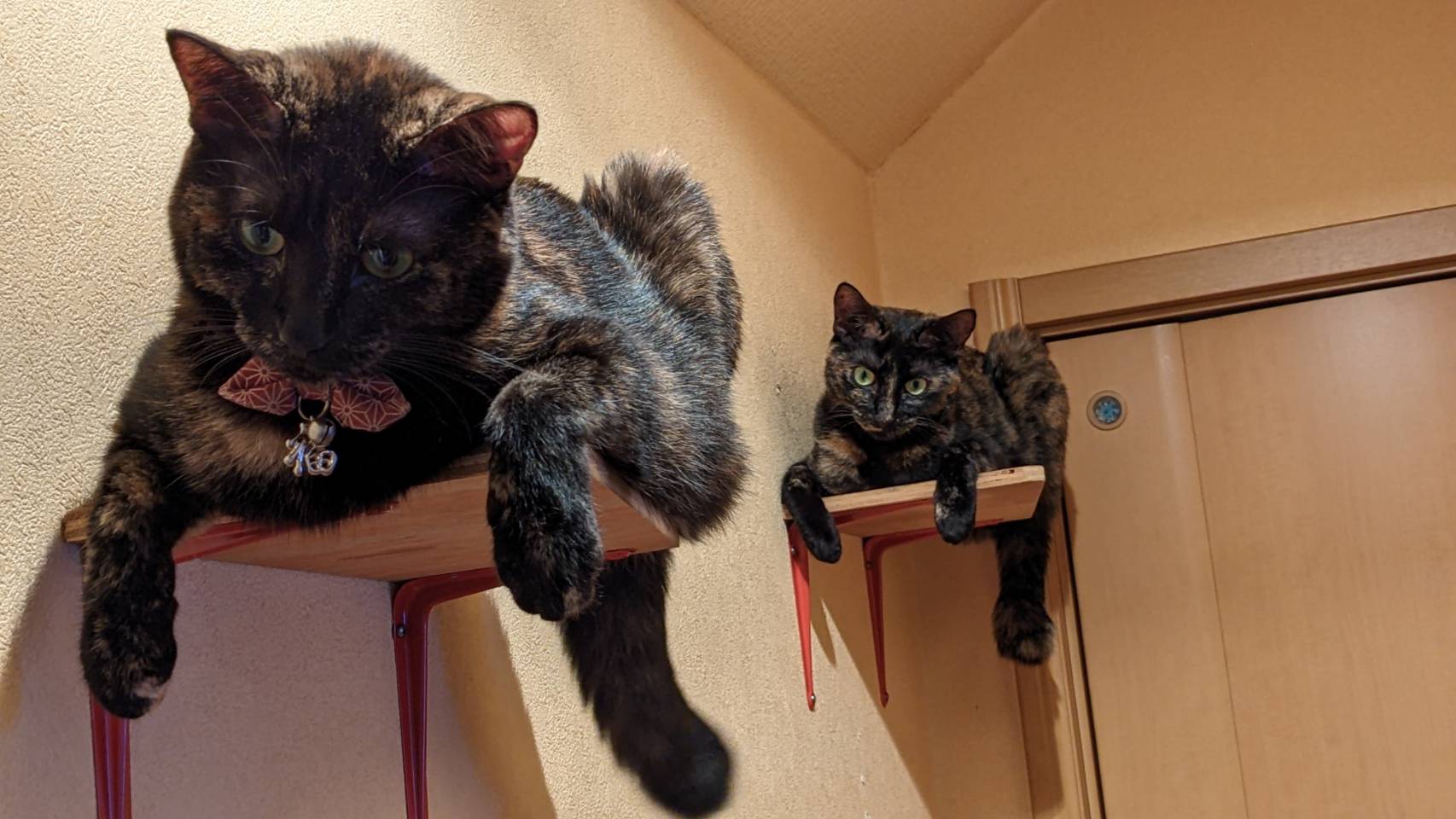 先住のゴマ君と窓際の猫タワーでお昼寝、幸せな光景ですね!