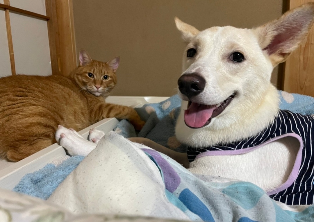 保護犬のてまりちゃんを後からお迎えして、麦くんはてまりちゃんを教育したり受け入れたりと愛情を注いでくれているそうです。麦くん、すごいね!!