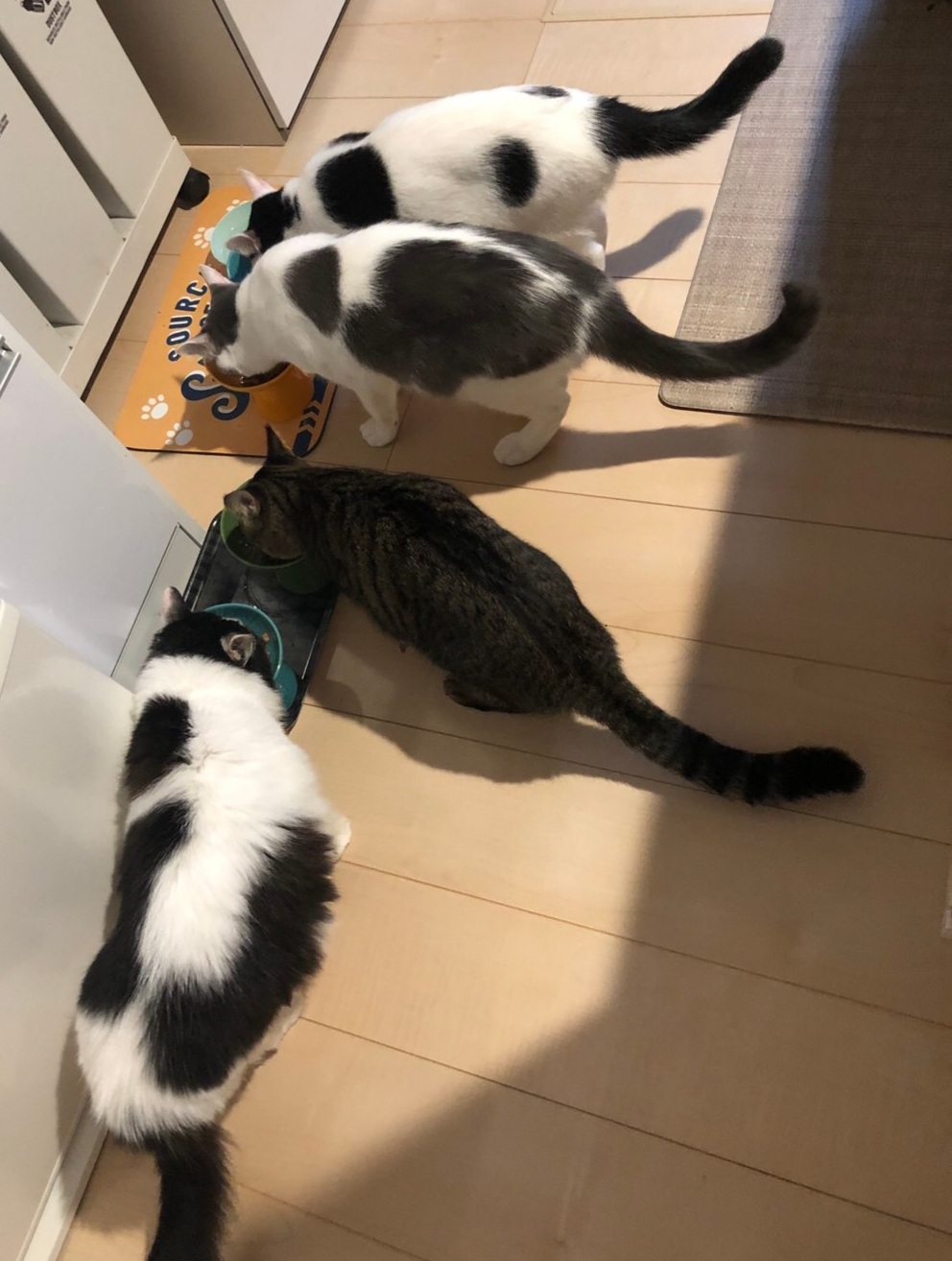 こちらのご飯タイムは奥からナナちゃん、ロックくん、ジョーくん、ククちゃんです。