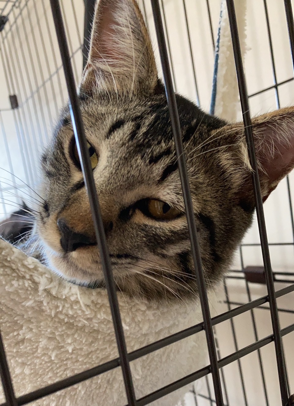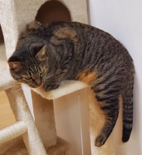賢くて慎重派? 娘さんが買ってくださった新しいタワーを探検中だそうです。