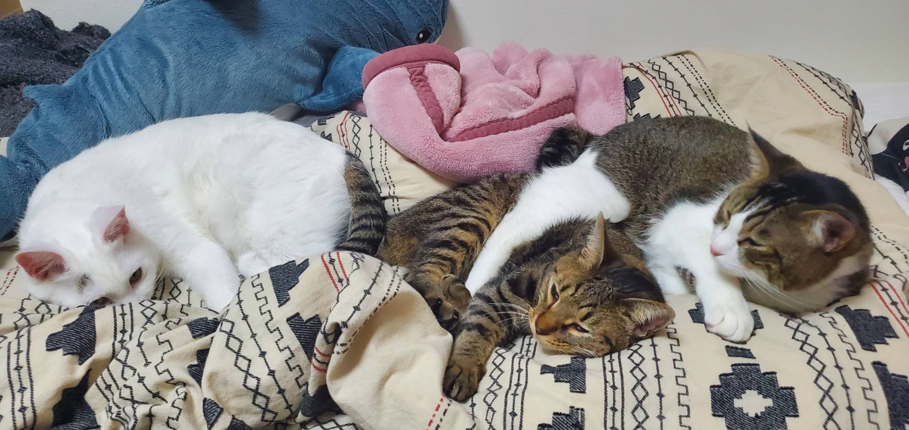 最初にぶんたさんの里親さんになってくださったこちらのおうちでは、ちょびたさんやこてつくんうめちゃん兄妹も引き受けて下さり先住さんなども含めてにぎやかな大家族です。
