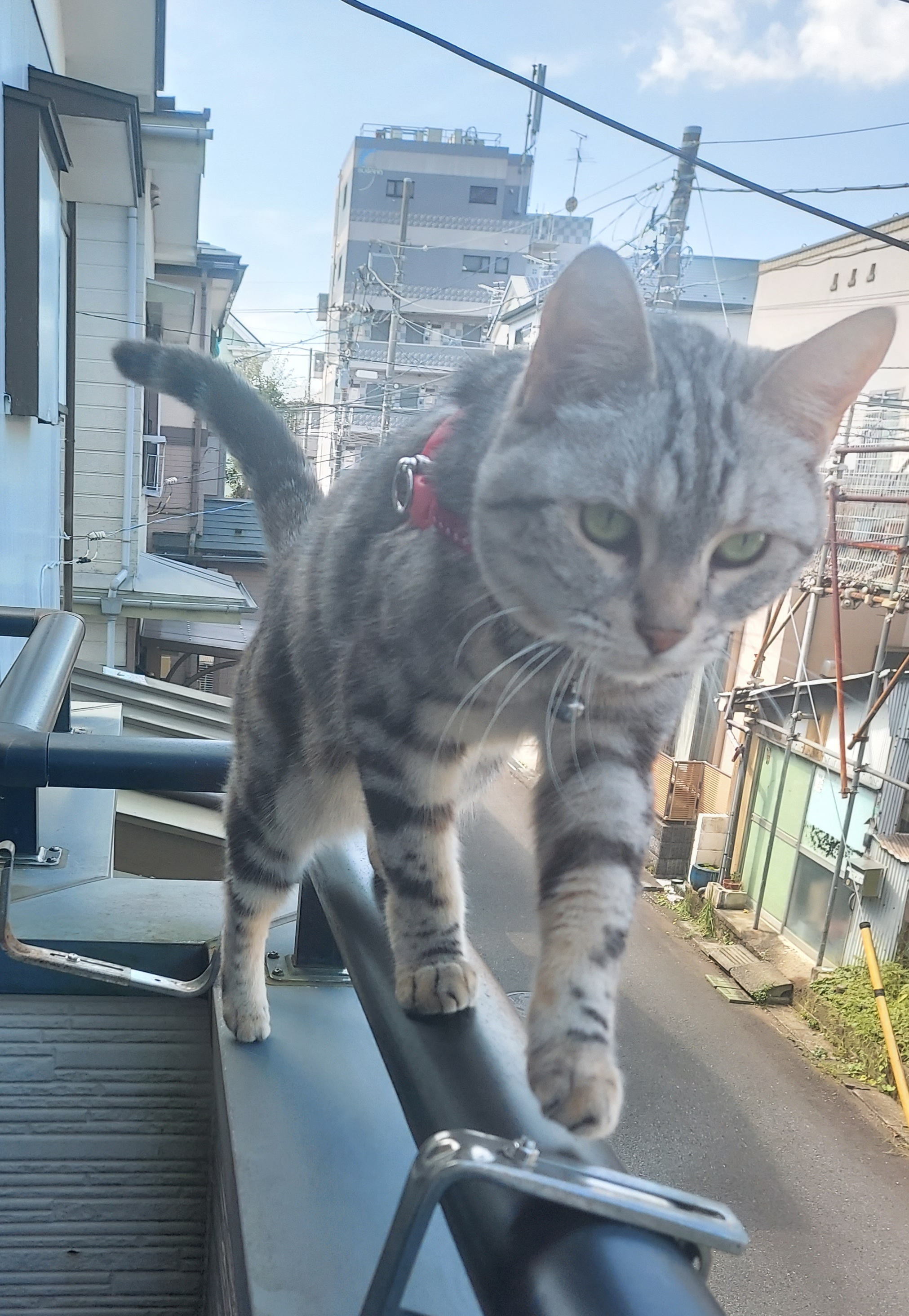 バルコニーの笠木を歩いたりおてんばなパティちゃん、バルコニーは出入り自由なのです。