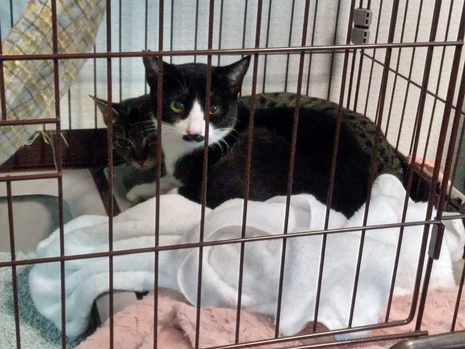 お部屋の角っこにひそんで一夜を明かし(床暖房点けたままにしてくださり、ゲージの扉を開けて戻るようにされました。