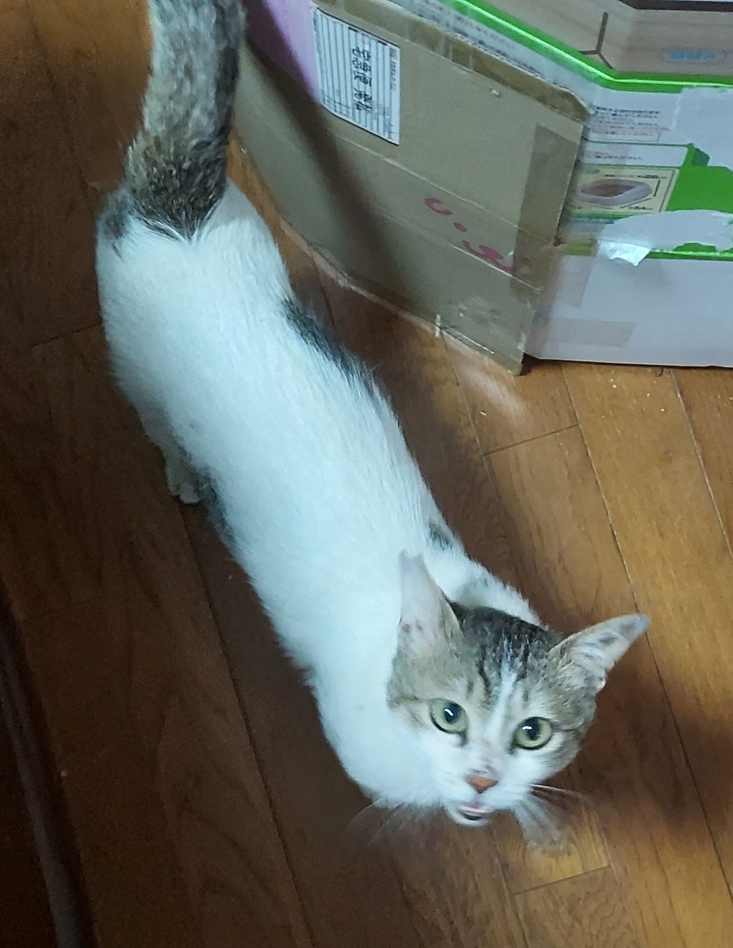 今朝は最後だからとモンプチの缶詰をみんにゃの分まで食べて、新しいおうちに向かう車の中で大量の下痢便をしました。