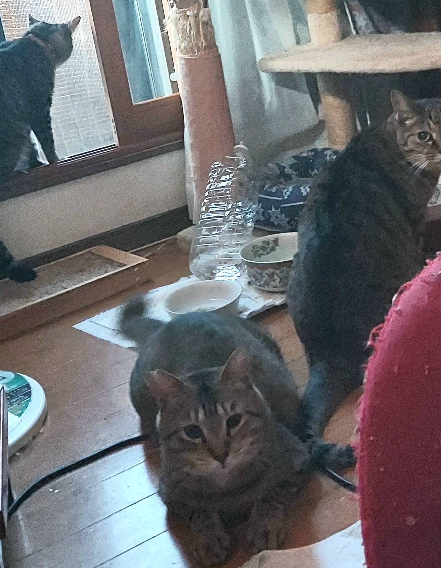 窓辺になずなちゃん、手前につくしくん、右にけいたとキジトラさんが3にゃん一緒の貴重な一枚です。