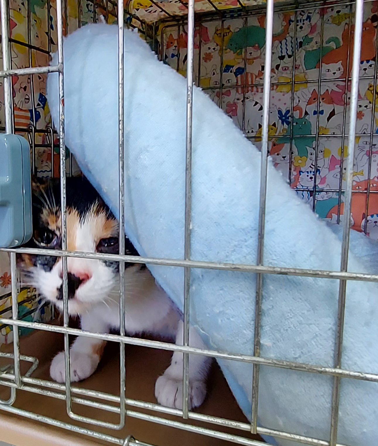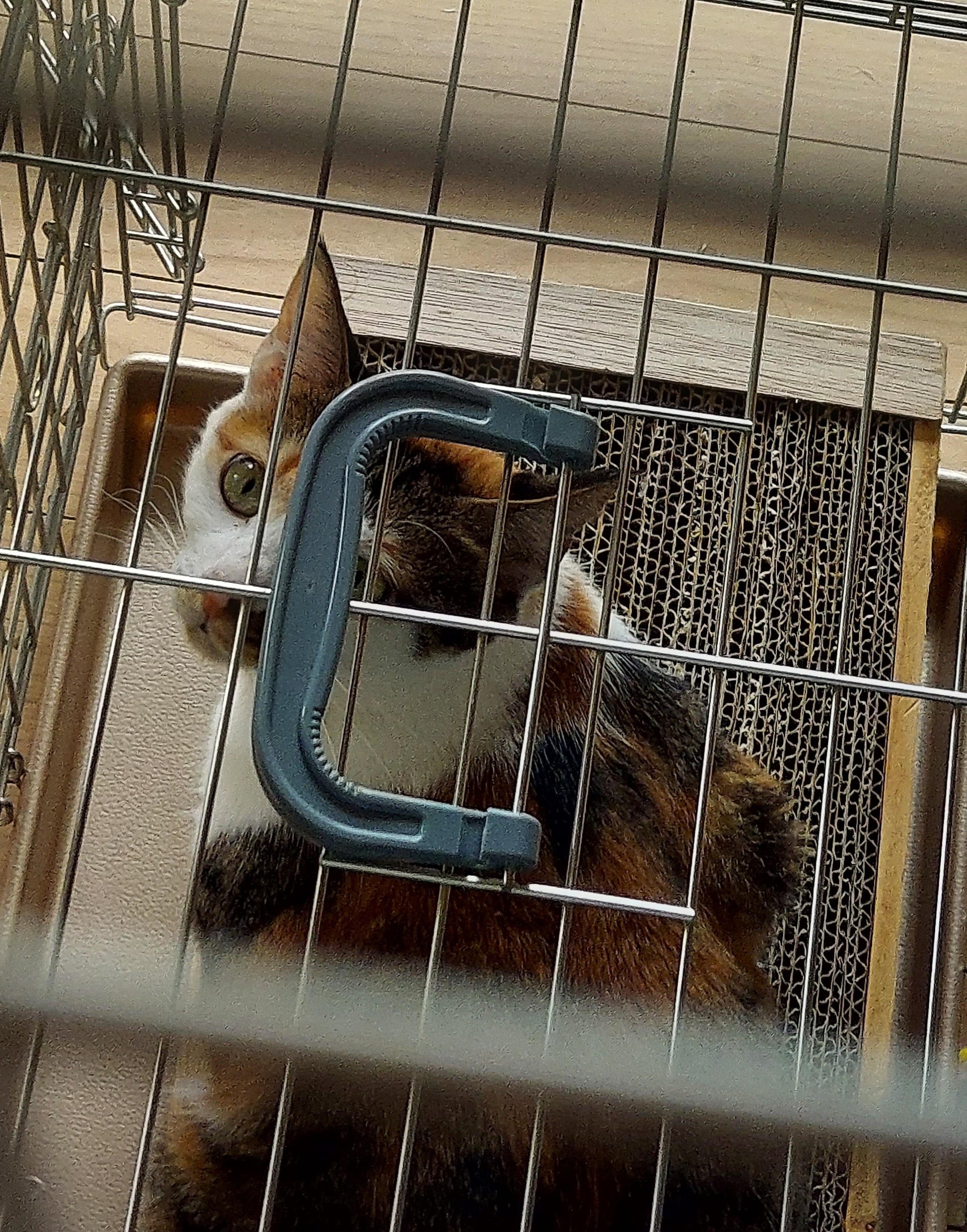 朝のあかりちゃん、小ゲージを1台保護猫部屋に置いてみたところ早速入りました。
