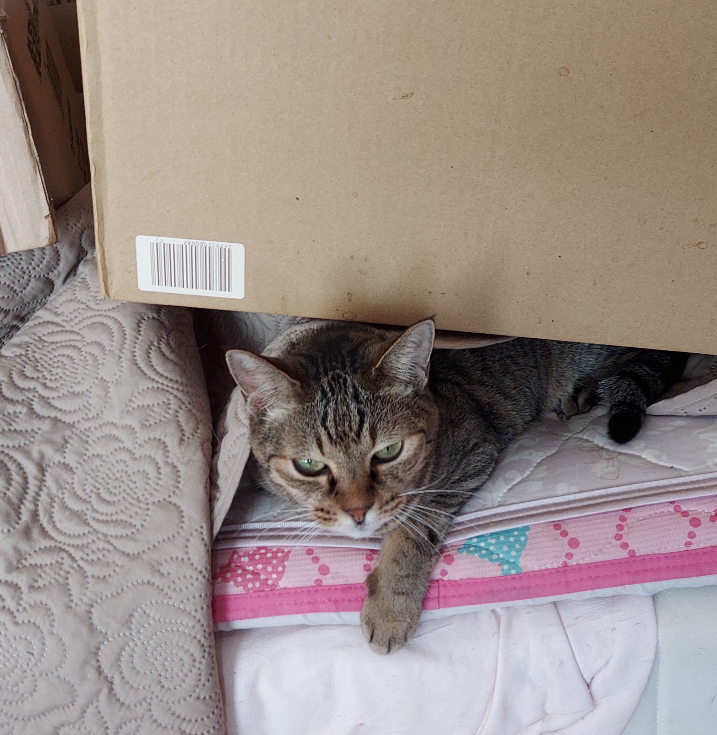 夜はベッドで一緒に眠るけいたはベッドが大好きで段ボールがあってもへっちゃら(笑)