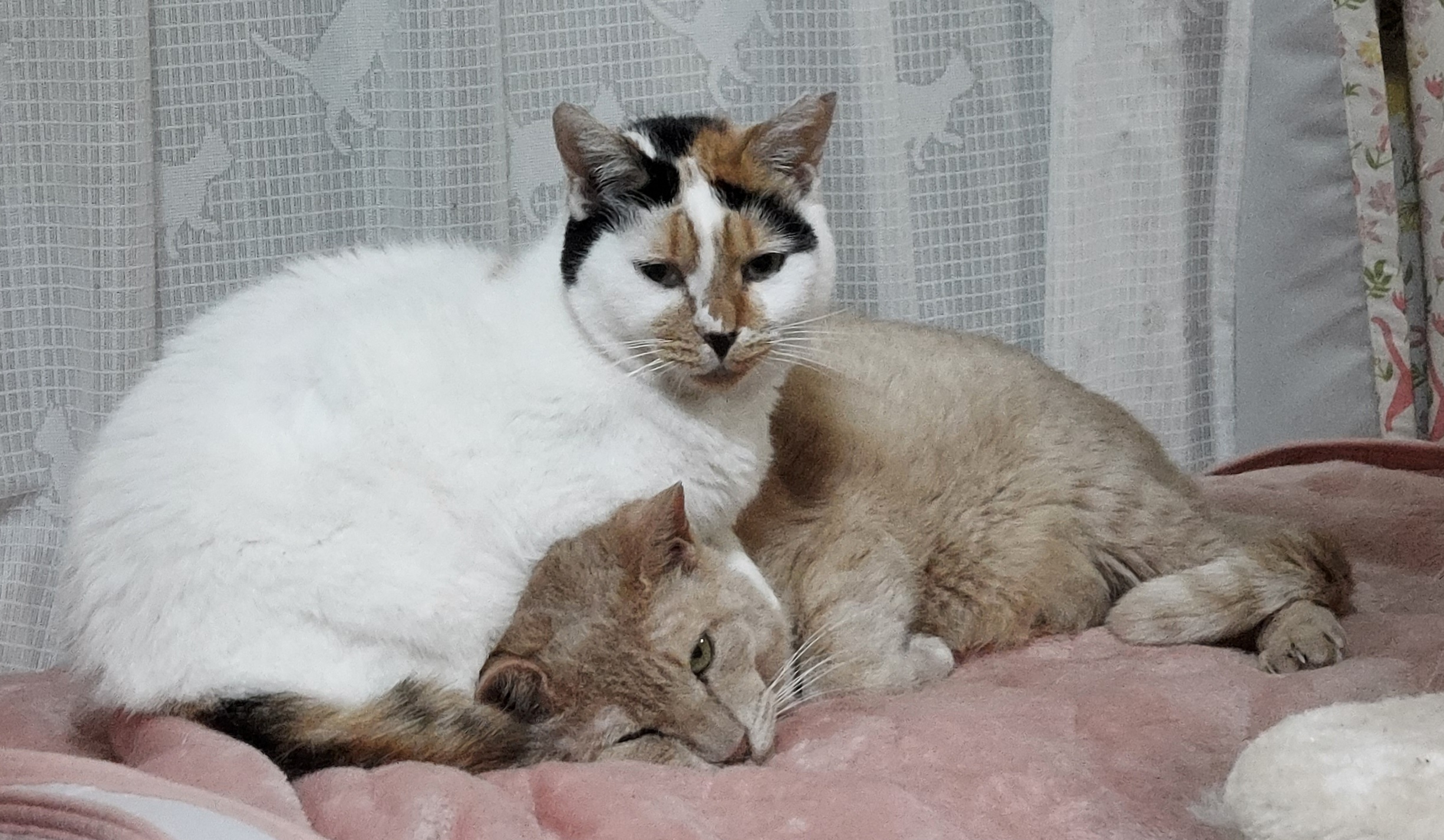 寝室12帖を半分づつで仕切って、13歳のすのお、けいた、大人になってから保護した年齢不詳のみかちゃん、なぎさの4匹組とすしろー、はま、こま3匹組に分かれて生活しています。